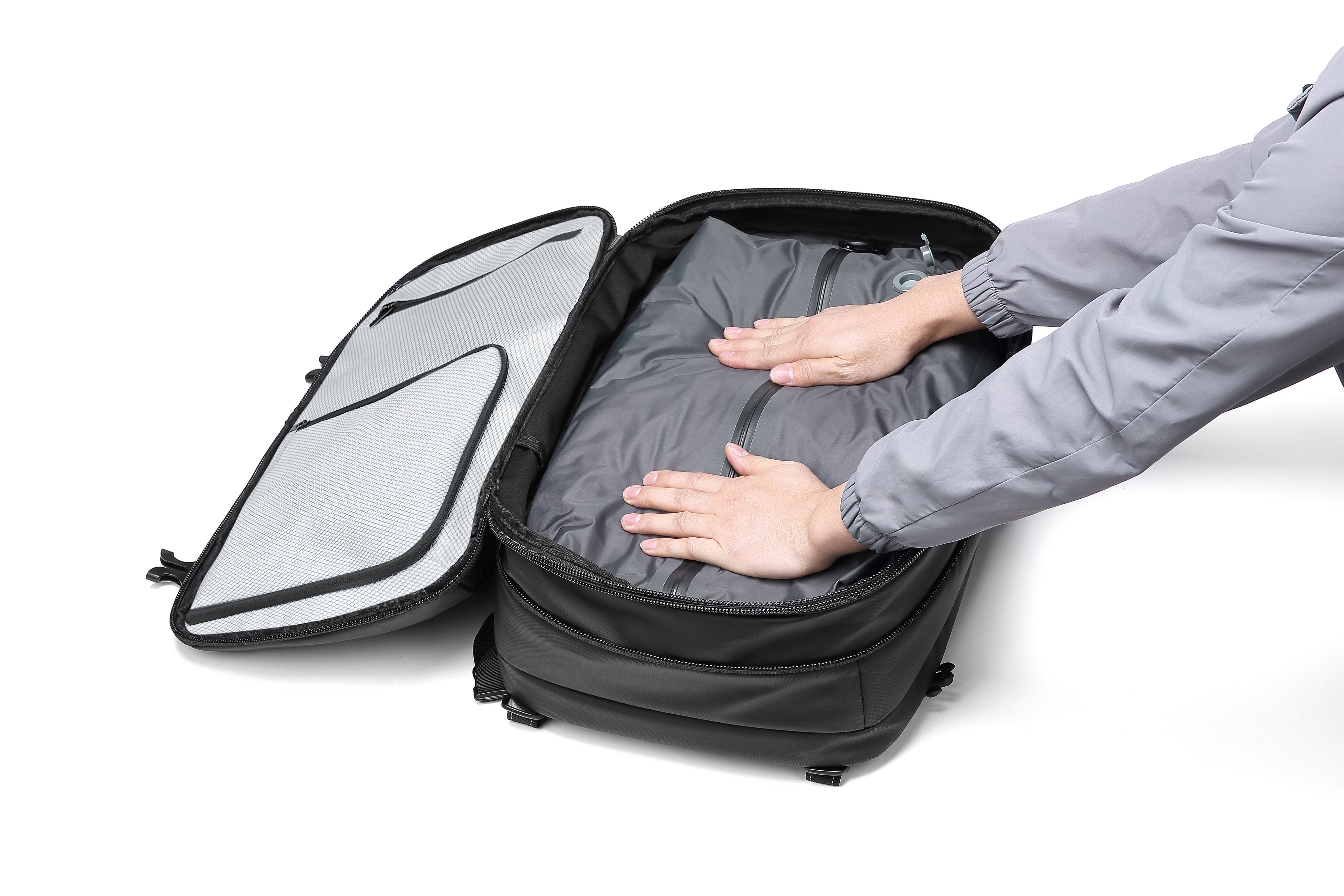 Komprimer tøjet direkte i tasken og få plads til langt mere, uden at overskride håndbagagemål eller betale overvægt.